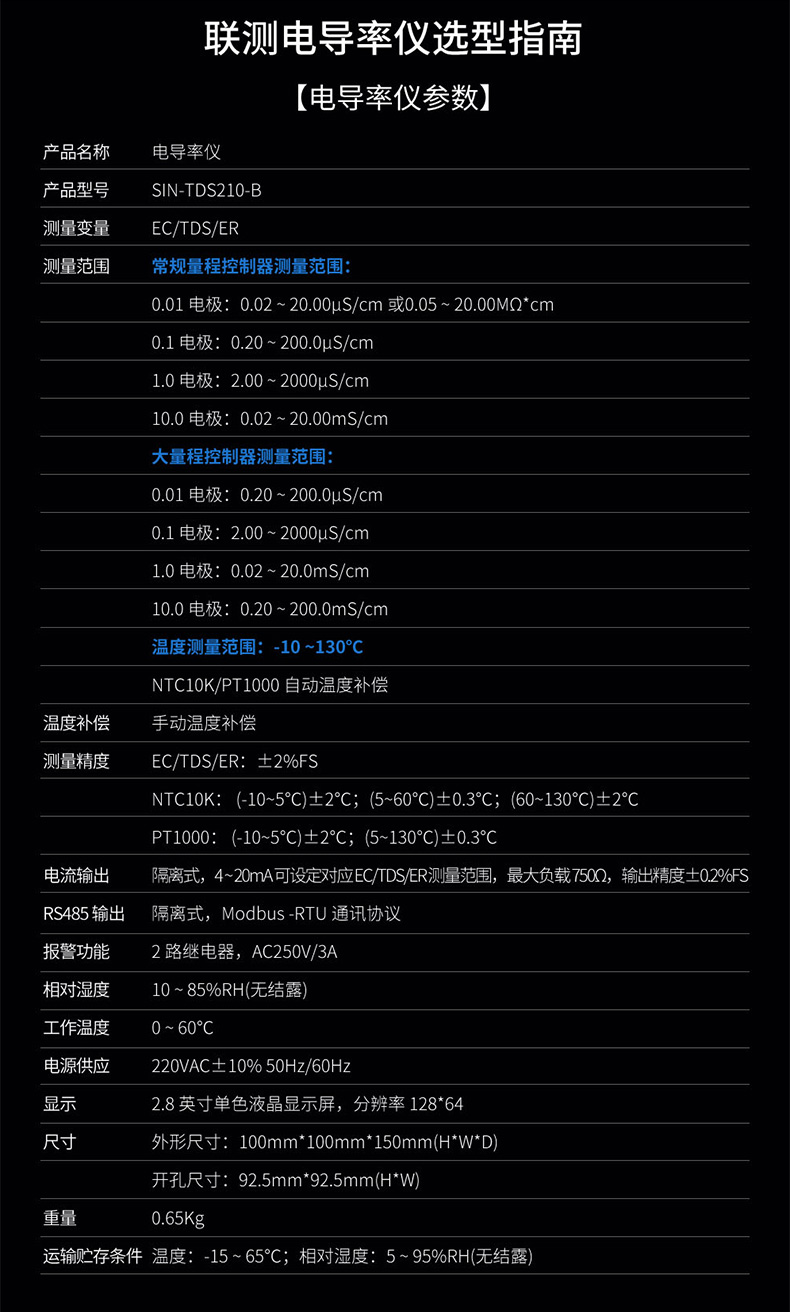 SIN-TDS210工業電導率儀表,可對各種工業用水的電導率(TDS)值進行連續測量和控制,本裝置廣泛應用于科學實驗裝備、化工、制藥、環保、冶金、造紙、食品、飲料及供水等行業。根據水工業的環境和特點結合國際供電標準,考慮了特殊環境的電氣設計規范,增加了220VAC供電。