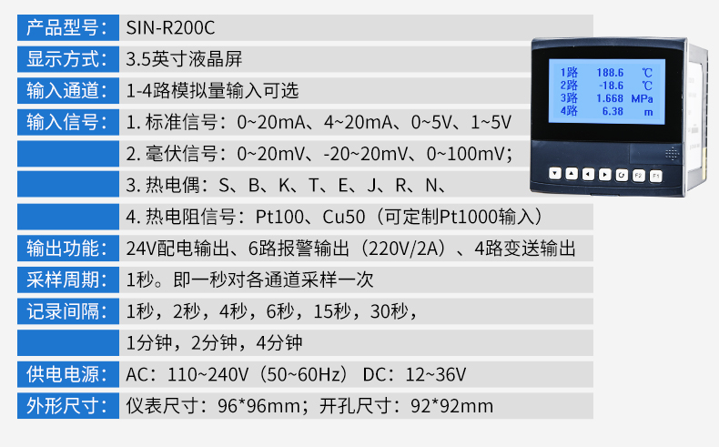 SIN-R200C顯示采用 3.5 英寸 高分辯率點陣式白屏黑字液晶屏,軟件上引入中文WINDOWS 的框架思路,并采用了數(shù)據(jù)壓縮技術。帶 USB 數(shù)據(jù)轉(zhuǎn)存功能,存儲時間最長可達 720 天。儀表全面采用了表面貼裝工藝,并采用多保護和隔離設計,抗干擾能力強,可靠性高。儀表可同時輸入 4 路萬能信號,輸入通道相互隔離,并具有報警控制、模擬變送、RS485/232 通訊等輸出功能,是一款功能齊全的漢顯儀。